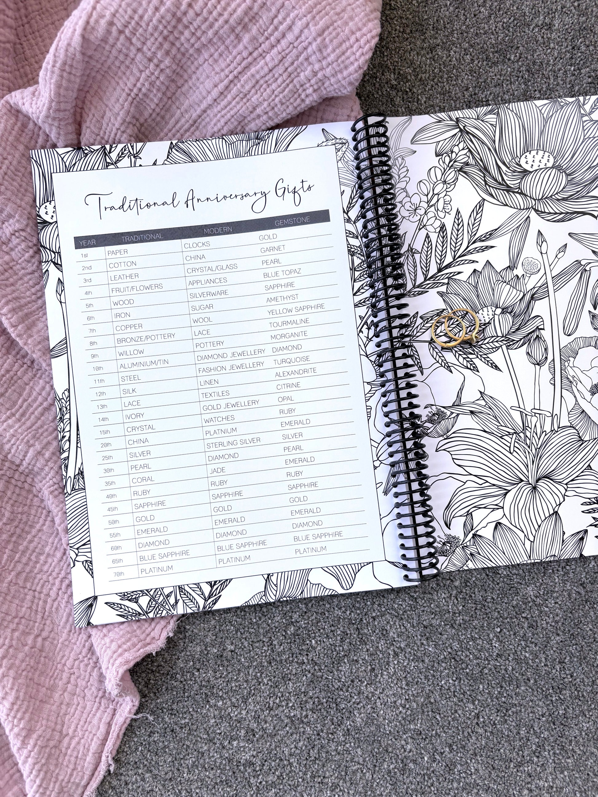 At the back, you’ll also find traditional anniversary gift ideas spanning all milestones, from the 1st to the 70th anniversary - adding a charming touch of tradition to your modern keepsake.